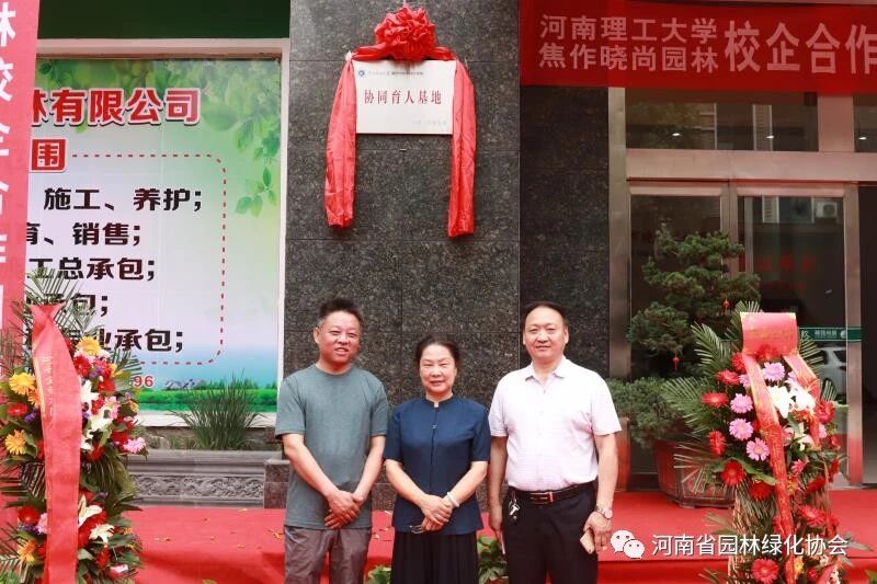 在与会领导、嘉宾热烈的掌声中,姜桂兰会长、赵红兵书记、张金虎总经理、杨富卿书记共同为“河南理工大学建筑与艺术设计学院-焦作市晓尚园林有限公司协同育人基地”揭牌。仪式结束后,所有与会人员合影留念,并召开了座谈会。